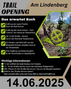 Wie schon im letzten Newsletter angekündigt, wird am 14. Juni der neue Trail am Lindenberg, die Flowline, von der Stadt eröffnet. Zusätzlich wird an diesem Tag auch die ILRC-Endurostrecke mit dem Namen “Linduro” eröffnet. Der Tag wird 9 Uhr mit einer Rettungsübung starten, wofür noch 2 Freiwillige als Statisten gesucht werden. Wer gerne mitwirken möchte, schreibt bitte eine Mail an vorstand@ilrc.de.